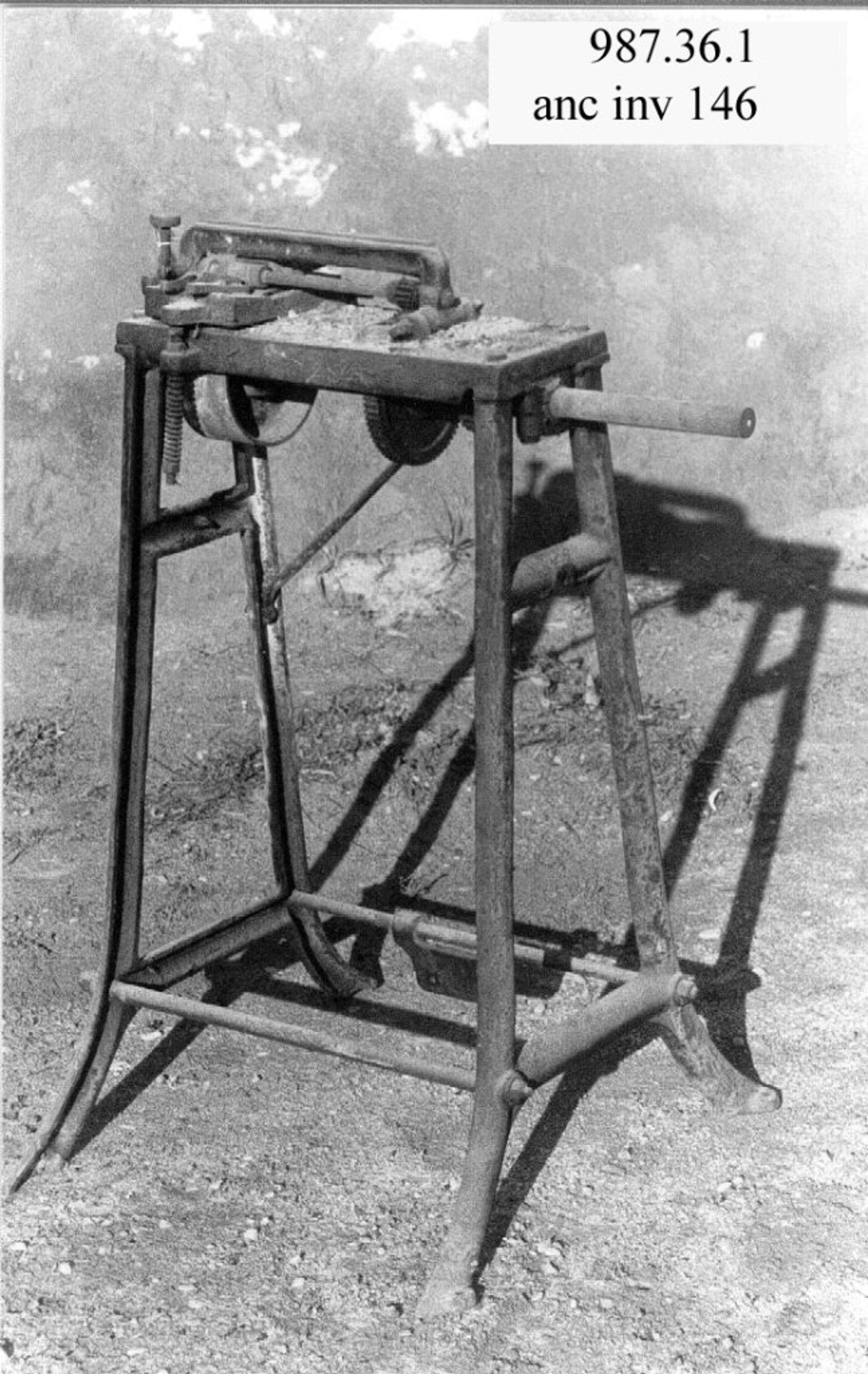 Machine en fonte servant à réduire d'épaisseur l'osier fendu pour en faire des éclisses (lamelles plates), munie d'une courroie, d'une poulie et d'une pédale actionnée au pied.